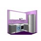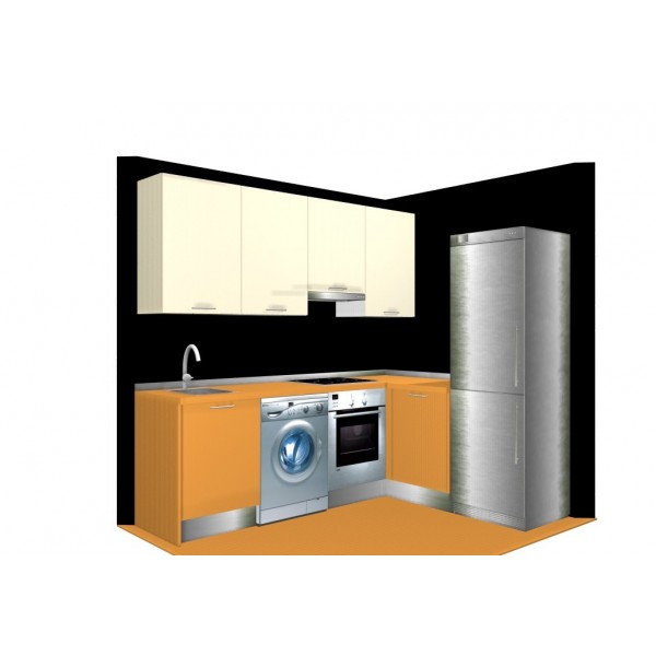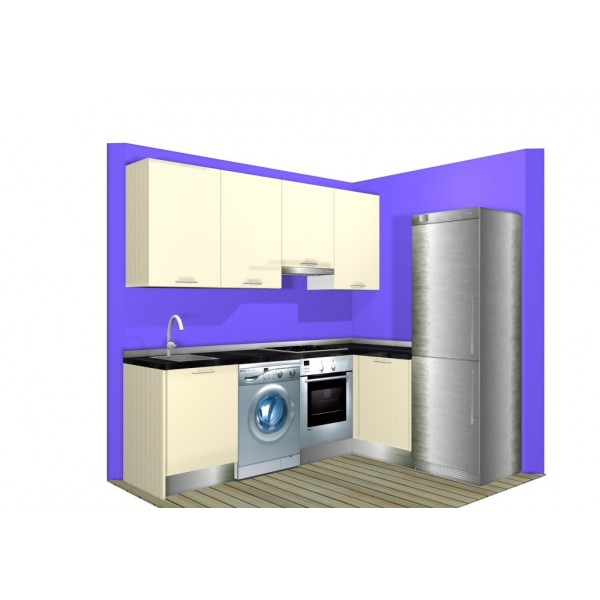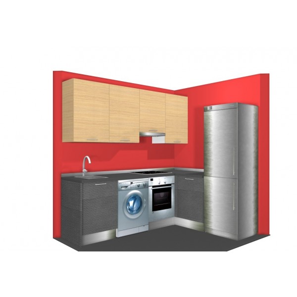 En éste diseño además de ubicar los electrodomésticos necesarios hemos aprovechado la zona de cruce con un mueble de rincón. En la parte alta destacar sólo el amueblamiento de la pared principal para dar sensación de amplitud.